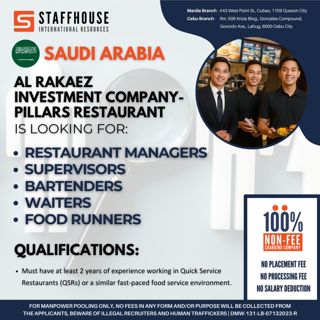 Now Hiring: Restaurant Managers, Supervisors, Bartenders, and Waiters for Pillars Restaurant in Saudi Arabia